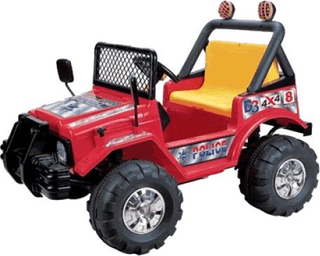 Džip - dvosed ima savršeno dopadljiv izgled terenskog vozila. Vaša deca će moći da ga voze brzinom čak do 6-7km/h, što je duplo brže od normalne brzine ljudskog hoda. Poseduje dve brzine za napred, vožnja unazad, rade i prednja svetla. Sigurnosni pojasevi, retrovizori i još niz detalja upotpunjuju izgled ovog džipa. Gabaritnih razmera sa velikim točkovima i metalnim osovinama, ne preporučuje se za decu mlađeg uzrasta. Pogodan je za upotrebu na ravnim površinama, ali i na travi, jer sa dvostrukim motorom veoma je moćan.