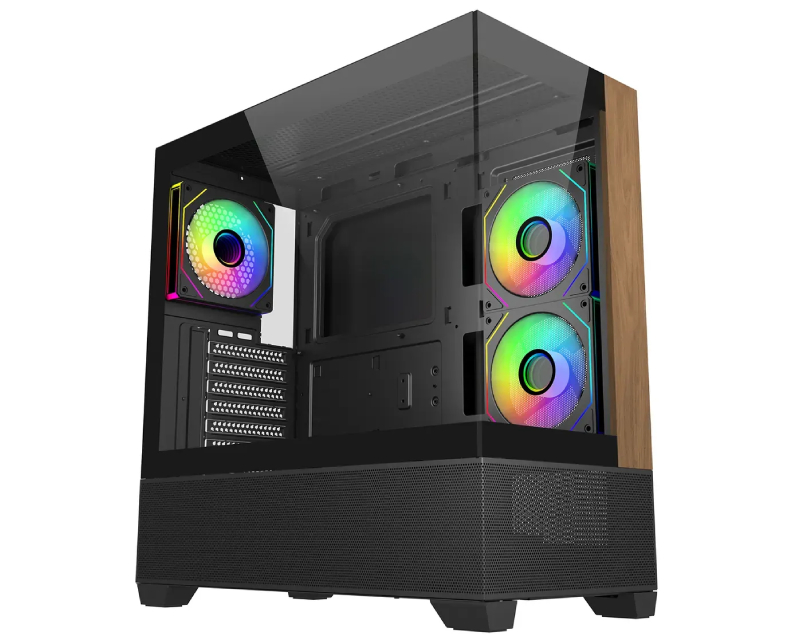 Osnovne karakteristike - Format kućišta: Mid Tower Podržani formati matičnih ploča: ATX,ITX,microATX Napajanje - Snaga napajanja: Bez napajanja Unutrašnja ležišta - Unutrašnja 3.5" ležišta: 1 (Max 2) Unutrašnja 2.5" ležišta: 1 (Max 2) Priključci napred - USB 3.2: 1x USB 3.2 Gen 2 x 2 Tip C USB 3.0: 2x Tip A Audio: 1x 3.5mm Ležišta za ventilatore - Poleđina: 1x 120mm Donja strana: 3x120mm Gornja strana: 3x120mm ili 2x140mm Desna stranica: 2x120mm Ugrađeni ventilatori - Poleđina: 1x120mm (ARGB) Desna stranica: 2x 120mm ARGB PWM reverse fan Ležišta za hladnjake - Donja strana: 120mm,240mm,360mm Gornja strana: 120mm,240mm,360mm Desna stranica: 120mm,240mm Kompatibilnost - Maksimalni broj slotova: 7 Maksimalna visina procesorskog hladnjaka: 170mm Maksimalna dužina grafičke karte: 425mm Fizičke karakteristike - Dimenzije: 454mm x 434mm x 218mm Materijal: Čelik,Drvo,Kaljeno staklo Boja: Crno-drvena Ostalo: ARGB Reklamacioni period - Reklamacioni period: 24 meseca