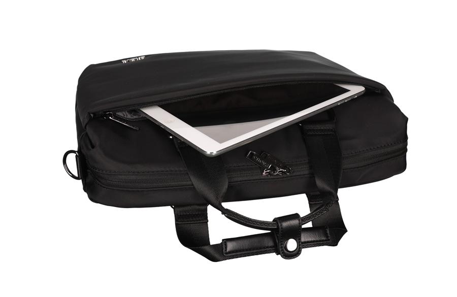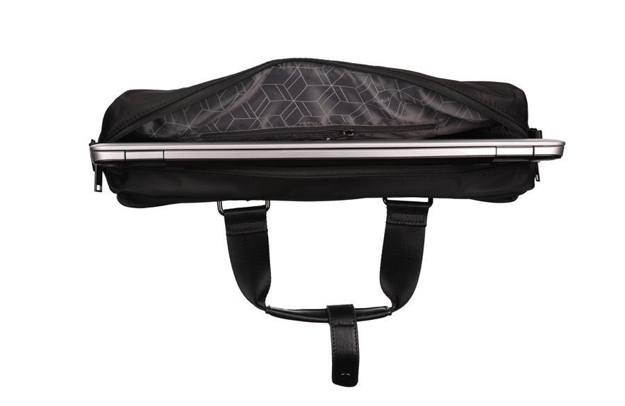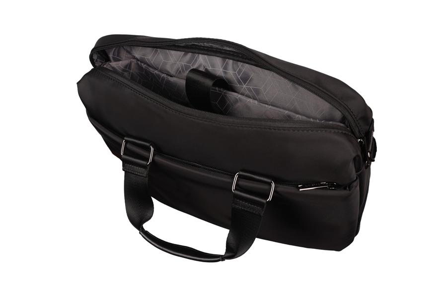 Glavna pregrada sa posebnim džepom za računar do 15,6″ (35,5x26x3cm), veliki odeljak za čuvanje dokumenata kao i organizatorom sa džepom sa rajsferšlusom, dva otvora za olovku i dva manja džepa. Veliki prednji i zadnji džep sa rajsferšlusom za odlaganje manjih dodataka. Torbu možete nositi u ruci, preko ramena zahvaljujući podesivom kaišu ili je jednostavno možete pričvrstiti za kofer.