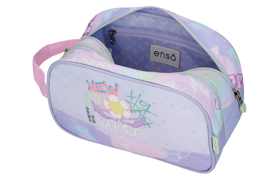 Enso NEW VIBES dečiji neseser sa 2 pregrade dizajniran je za devojčice koje žele uredno organizovan prostor za sve proizvode za higijenu, kozmetiku ili ličnu negu. Kombinuje pastelni NEW VIBES dizajn, kvalitetan materijal i praktična rešenja, čineći ga savršenim saputnikom za školu, trening ili putovanja. Izrađen je od izdržljivog i laganog poliestera, jednostavan je za održavanje i dovoljno čvrst da izdrži svakodnevnu upotrebu, bilo kod kuće ili u pokretu.