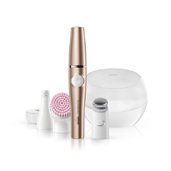 Prvi svetski epilator, cleaner i toner. Uređaj na punjenje – uključuje 4 dodatka; bronzanu kapu, postolje, torbicu za čuvanje i pearl Braun FaceSpa Pro je prvi svetski 3-u-1 aparat za epilaciju, čišćenje i toniranje kože. Uz pomoć didatka za epilaciju nežno uklanja dlačice sa lica iz korena, za glatku kožu. Četka za čišćenje lica nežno uklanja prljavštinu sa osetljive kože. MicroVibration glava masira kožu i ravnomerno nanosi kremu. Ovo premium izdanje sadrži i elegantnu torbicu za čuvanje. Braun FaceSpa Pro. Braun FaceSpa Pro je prvi svetski 3-u-1 aparat za epilaciju, čišćenje i toniranje kože. Za sjajnu i negovanu kožu. Poboljšani izgled kože MicroVibration glava masira kožu i pomaže pri ravnomernom nanošenju kreme. Za čistiju kožu Nežna četka za čišćenje lica. Dermatološki testirana. Sjajna koža Ekstra slim glava epilatora sadrži 10 mikro-otvora za nežno hvatanje i najtanjih dlačica (0.02mm) koje vosak ne može da ukloni. Nežno utapkavanje za poboljšani izgled kože. U Aziji, nežnost je suština održavanja glatke kože. Utapkavanje se smatra metodom koji je najzdraviji za kožu. Utapkavanje MicroVibrirajuće metalne glave pomaže ravnomernom nanošenju seruma i krema. Napravljena od finog metala radi osvežavajučeg osećaja na koži, i sa ergonomičkim dizajnom prilagođava se svakom licu. Za osveženi izgled koristite ovu četku za kožu oko očiju kao jutarnju ili večernju beauty ritual. Efikasnije i više higijensko nanošenje nego kada to radite prstima. Ultra-delikatno utapkavanje Stavite serum ili kremu na FaceSpa Pro MicroVibrirajuću glavu. Naprava nežno vibrira omogućavajući bolje nanošenje produkta za negu kože. Možete je koristiti i oko očiju kada je isključena, za osvežavajući osećaj. Nežno čišćenje lica Koristite nežnu četku za dnevno čišćenje i pripremu kože pre nanošenja šminke, kao i za uklanjanje šminke. Prelazite četkom sa nežnim pritiskom i kružnim pokretima po T-zoni, obrazima i bradi. Precizna epilacija lica Prelazite epilatorom u suprotnom smeru od suprotnom smeru od rasta dlake. Nema potrebe za jakim pritiskom, 10 mikro-otvora lako hvataju i najtanje dlačice. Detektor pametne glave Osigurava da se izvuče maksimum performance uprkos tome koji se dodatak koristi. 4 personalizovane opcije Izaberite između dve brzine i 2 inteziteta, za potpuno jedinstveno iskustvo. Timer za tretman Tretira svaku oblast 20 sekundi, a nakon toga aparat pulsira i označava vreme za prelazak na narednu oblast. Baterija na punjenje Osigurava da je FaceSpa uvek spreman za korišćenje.
