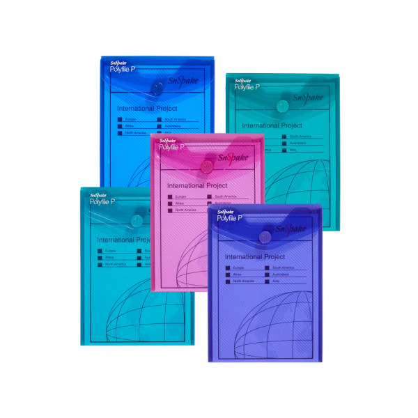 Premium fascikla pismo sa zatvaranjem na dugme. Snažan polipropilenski materijal sa atraktivnim reljefom. Mix popularnih boja. 1 x Plava, 1 x Zelena, 1 x Roza, 1 x Ljubičasta, 1 x Tirkizna. Praktičan sistem indeksiranja, jedinstven za Snopake fascikle.