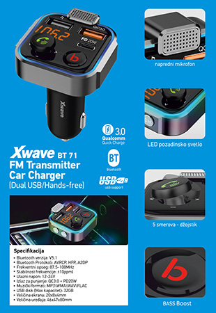 - Naziv: FM transmiter za kola/Bluetooth/LCD/mp3/wma/wav/flac/USB/punjenje QC3.0+PD20W /Handsfree/BASS Boost
