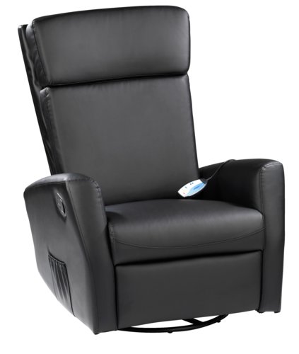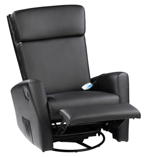 Kvalitetna fotelja za masažu od crne veštačke kože, sa ugrađenim osloncem za noge i nagibnim mehanizmom.