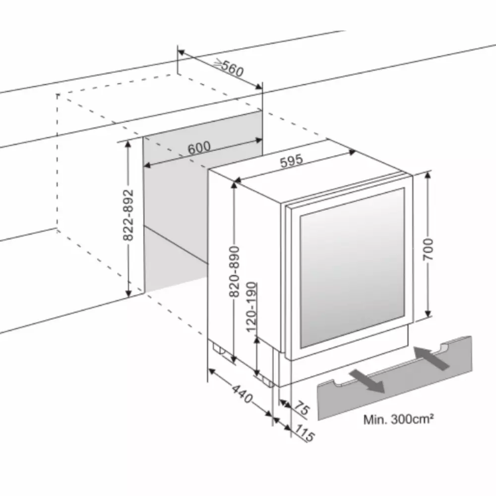 Ovaj model podpultnog ugradnog frižidera za pivo je ugrađenog tipa ispod pulta, dizajniran za savršenu integraciju u kuhinjske elemente širine 60 cm i visine postamenta od 12 cm. Njegov promišljen dizajn i elegantan, minimalistički izgled čine ga idealnim izborom za moderne kuhinje u kojima su funkcionalnost i estetska savršenost podjednako važni. Model je dizajniran za ugradnju ispod pulta u kuhinjske elemente visine 82 cm. Sa stvarnom visinom od približno 820 mm i visinom vrata od 700 mm, savršeno se uklapa u standardne kuhinjske pultove, uz visinu podnožja od 12 cm, omogućavajući pravilno ventiliranje i estetski prihvatljivu instalaciju. Zahvaljujući kompaktnom dizajnu, ovaj frižider je savršen izbor za sve koji traže diskretno, a profesionalno rešenje za skladištenje piva, bez kompromisa u izgledu prostora. mQuvée BS60AB-700 kombinuje moderan dizajn, funkcionalnost i potpunu integraciju u kuhinjsko okruženje.4. Saveti za pravilno instaliranje