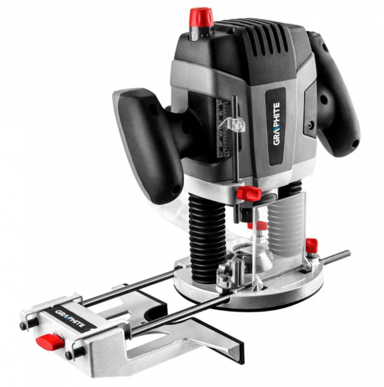 - GRAPHITE glodalica sa moćnim motorom od 1300 W, dizajnirana za glodanje rupa, žlebova, ivica i profila u svim vrstama drveta i materijala na bazi drveta, kao i u plastici i aluminijumu. Uređaj ima funkciju kontrole brzine i dubine glodanja. Raspon brzine u praznom hodu je od 11.000 do 28.000 min-1. Usmerivač ima blokadu vretena i blok dubine glodanja. Dubina glodanja može se podesiti pomoću tri instrumenta: 8-stepeni krajnji graničnik, ograničivač dubine sa glatkim podešavanjem (opseg 0-55 mm) i dugme za precizno podešavanje dubine (tačnost 0,1 mm). Uređaj je opremljen stabilnom aluminijumskom bazom sa plastičnim poklopcem, što omogućava lako rukovanje uređajem na svim vrstama površina. Vođice motora ugrađene su u aluminijumsko telo sa utičnicama koje su podvrgnute specijalizovanoj površinskoj obradi, zahvaljujući čemu uređaj karakteriše povećana preciznost tokom prodiranja. Ergonomske ručke rutera prekrivene su neklizajućim materijalom, tako da je upravljanje uređajem ugodno i sigurno. Pokrivač i adapter za usisavanje prašine napravljeni su od prozirnog polikarbonata. Ruter je opremljen velikim dugmetom za kontrolu brzine koji se nalazi nadomak desnog palca operatera. Na levom ručku glodalice nalazi se ergonomska poluga bloka vođica karoserije, omogućavajući joj upravljanje bez skidanja ruke. Uključeni su u mašinu: ravni ključ, čaura za vođenje za kopiranje prema predlošku, šiljak za kružno sečenje, adapter za usisavanje prašine sa redukcijom, tri stezne čaure prečnika 6, 8, 12 mm, aluminijumska paralelna vođica opremljena specijalnom plastični poklopac, zaštita od ogrebotina i mehanizam koji omogućava precizno podešavanje položaja glodalice prema ivici materijala. Alat je opremljen fleksibilnim i čvrstim kablom za napajanje u gumenom premazu, dužine 3 m, takođe dizajniranom za profesionalne i industrijske primene u zatvorenom i na otvorenom.