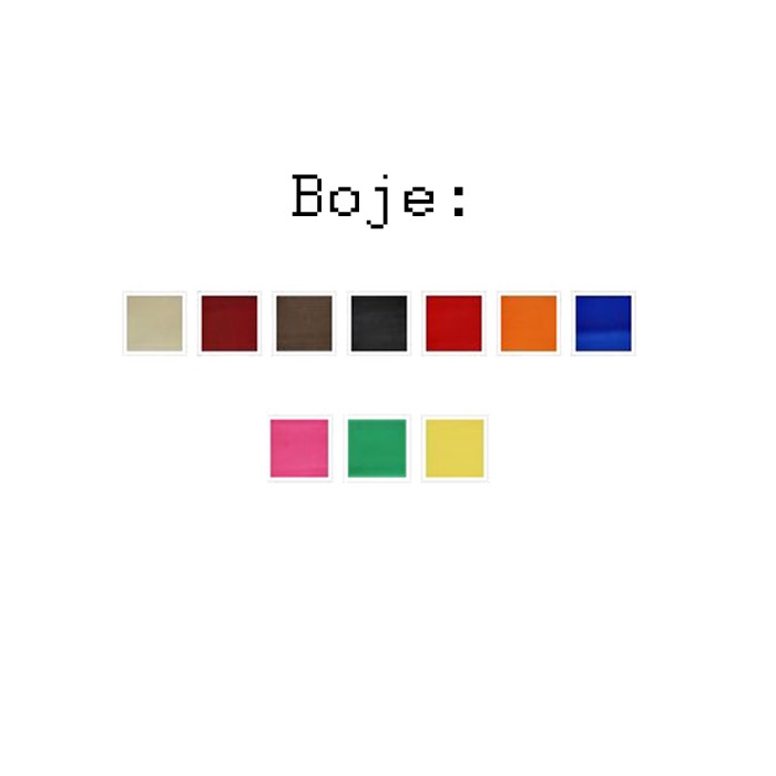 - Izbor više boja: bež, bordo, braon, crna, crvena, narandžasta, plava, roze, zelena, žuta