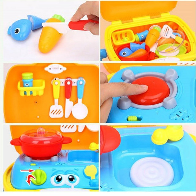 - Sadrži komplet za male kuvare: šporet i sudopera sa česmom, tiganj, posuda za kuvanje, tegla za začin, hrana i pribor neophodan za kuvanje