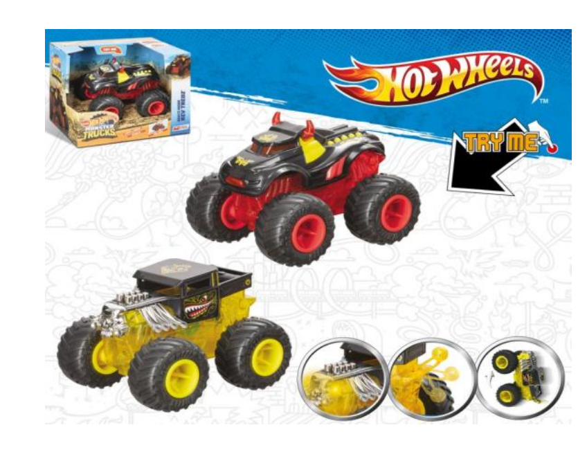 - Hot Wheels Monster truck 1:43, sa svetlom i zvukom, dostupna su 2 različita modela. Kretanje pomoću sistema pull back.