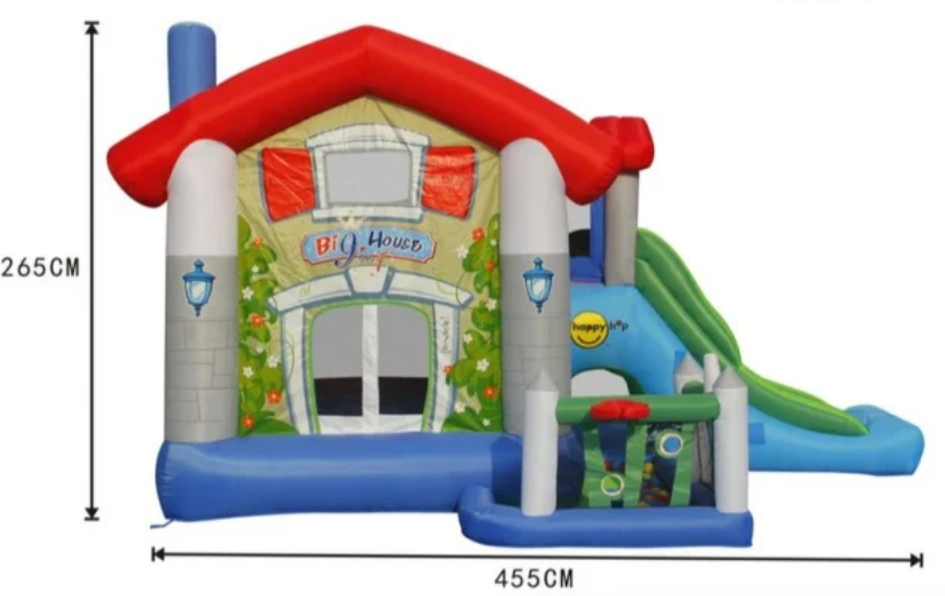 - Dimenzije naduvane igraonice: 455 × 330 × 265 cm (dužina × širina × visina)