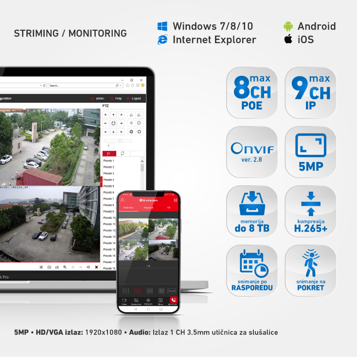 - Broj kanala 9 CH (2592x1944, 2048x1536, 1920x1080, 1280x960, 1280x720 itd.)