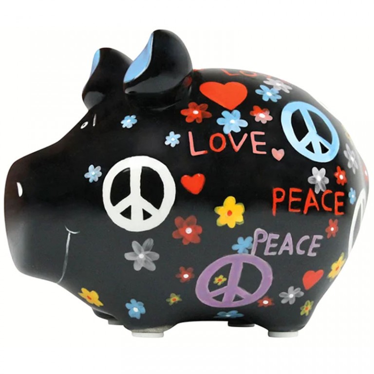 - Kasica - hipi prasica, sa simbolima mira i ljubavi. Na dnu kasice je gumeni čep koji se vadi. Materijal: glazirana keramika. Dimenzije: 12x9xH9cm