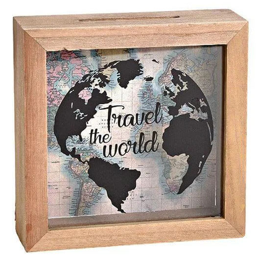 - Drvena kasica sa staklom sa prednje strane. Ram kasice je u svetloj boji drveta sa otvorom za ubacivanje parica. Cela zadnja strana kasice se otvara, i ima natpis "Travel the world" i kartu sveta na poleđini. Dimenzije kasice su 15x15x5CM.