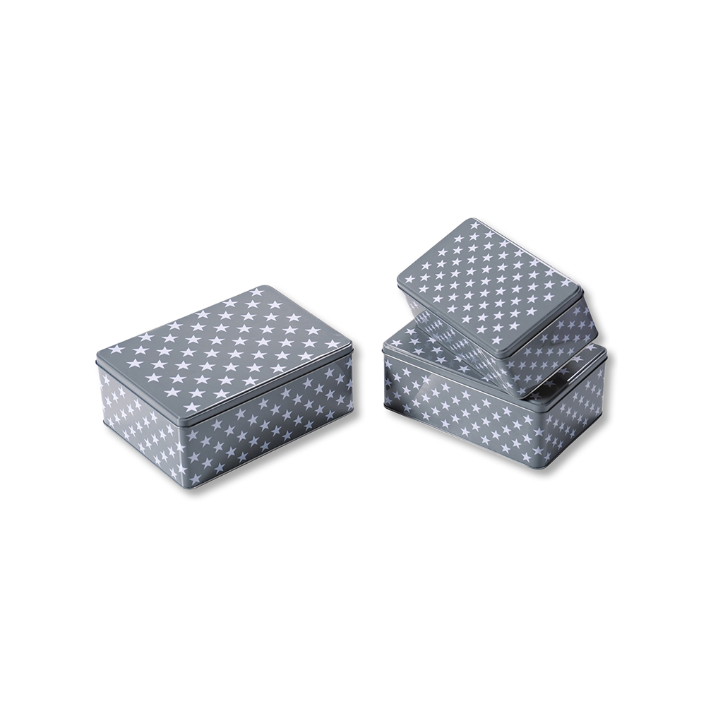 - Set od tri metalne kutije u sivoj boji sa zvezdama, namenjene za skladištenje različitih predmeta.