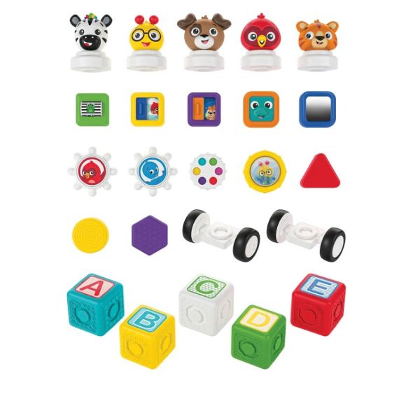 - Uključuje 5 blokova slova, 5 dodataka za bebi Ajnštajn, 2 nastavka za osovinu točka i 12 senzornih dodataka kao što su klizači, zvečke, ogledala, zupčanici i oblici.
