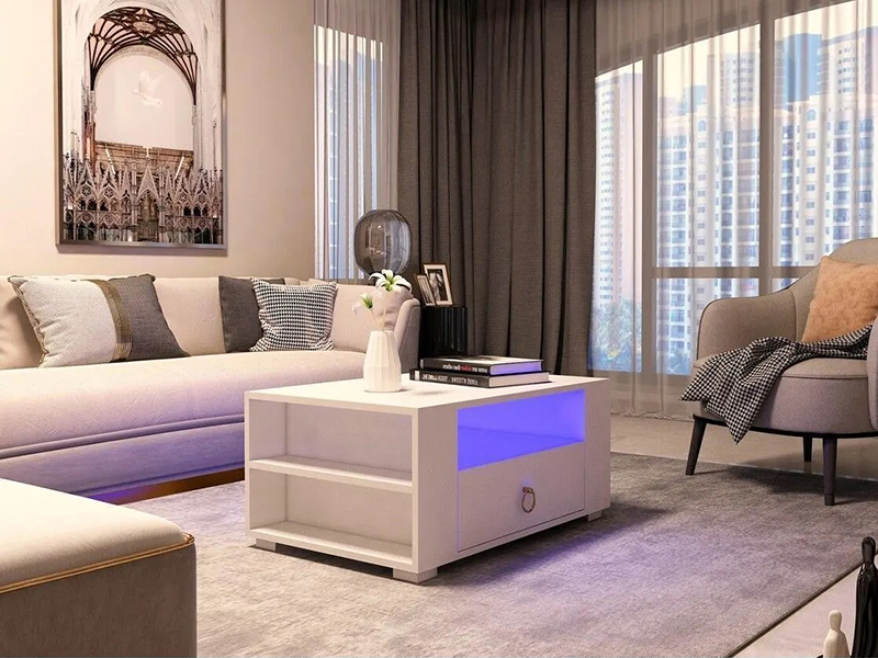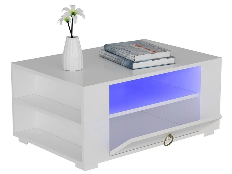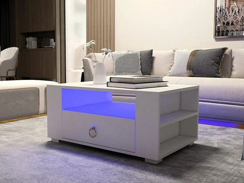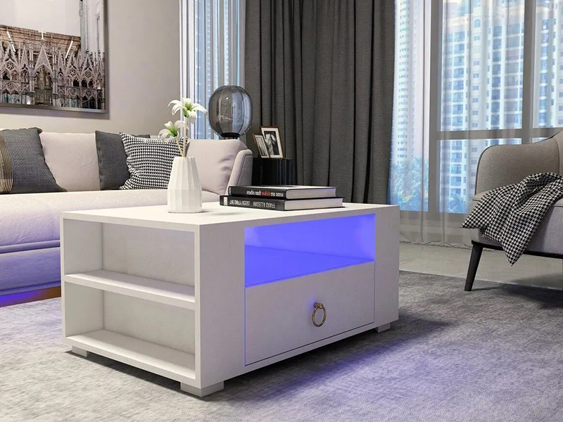 Klub sto Klajn beli sa led rasvetom * Dimenzije : Š:90 cm D:60 cm V:41,6 cm Klub sto Klajn beli sa led rasvetom izrađen je od kvalitetnog univera 18 mm obloženog melaminskom folijom u beloj boji kant abs traka. Elegantan dizajn i LED osvetljenje daje dubinsku percepciju stolu. To ga čini odličnim komadom nameštaja koji svakoj prostoriji dodaje stil i ambijent. U okviru E1 standarda materijal ne sadrži kancerogene supstance.