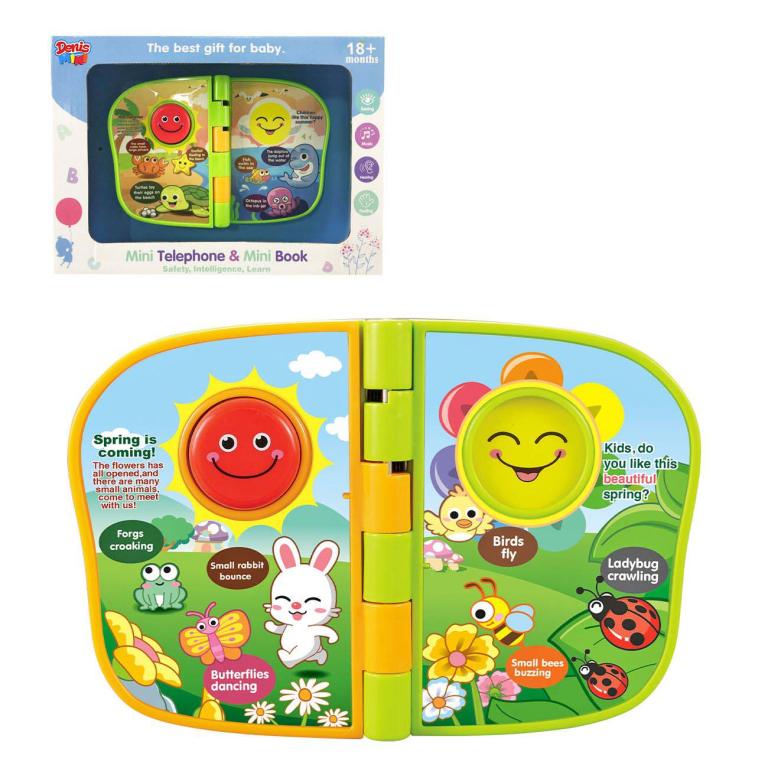 - Mini telefon + mini knjiga, didaktička igračka za bebe sa svetlosnim i zvučnim efektima. Spiralni povez za lakše pretraživanje. Stimuliše: senzomotoriku, slušno, vizuelno. Materijal: plastika. Baterije potrebne za rad: 2x AAA, nisu uključene u komplet. Dimenzije pakovanja: 23,5 x 5 x 17 cm. Preporučena starost: 18 meseci+
