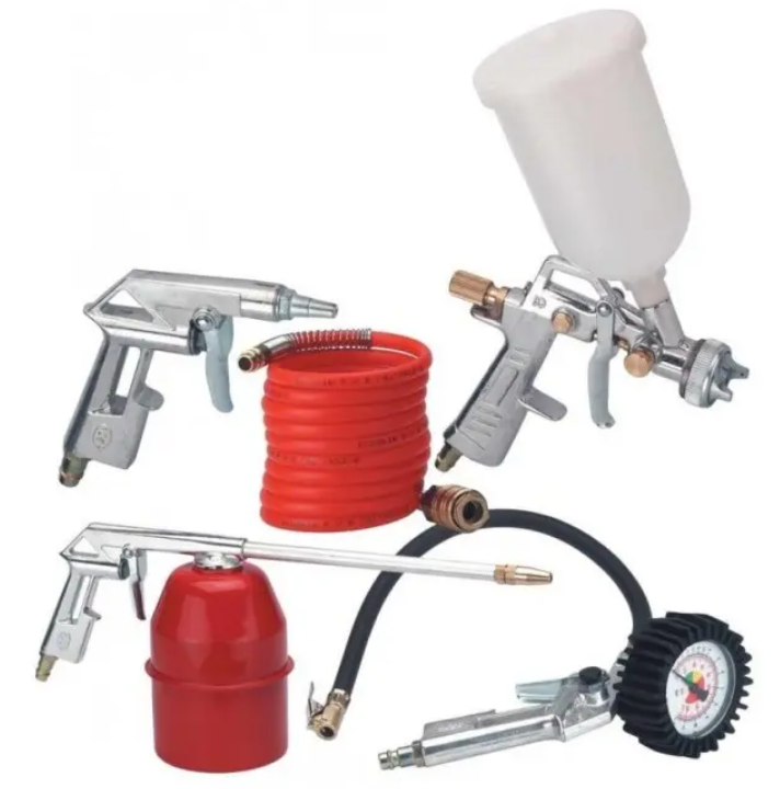 - Pištolj za bojenje u setu sa dodacima 5/1 EINHELL PROFI. Veoma kvalitetan i dugotrajan, podrazumeva i korisnost kako u kućnim poslovima tako i u poslovima koji imaju primenu pištolja za prskanje sa protokom za tečnosti i komprimovanim vazduhom, sa usisnom posudom, nastavak za pumpanje guma sa manometrom, pištolj za izduvavanje, spiralno crevo.