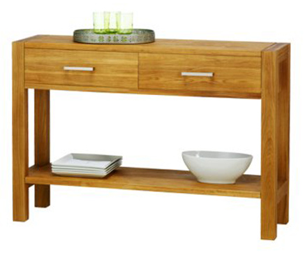 Luksuzan konzolni stočić Beewe od nauljene hrastovine i furnira sa dve fioke. Nameštaj po potrebi tretirajte uljem za drvo, da bi drvo bilo zaštićeno od isušivanja i da bi dugo vremena ostalo lepo.