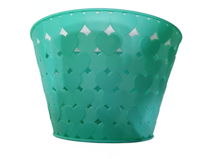 Prednja korpa za dečije bicikle, tirkizne boje, u obliku srca, lagana i izdržljiva. Pogodna za transport sitnica i igračaka, lako se montira i idealna je za svakodnevnu upotrebu.