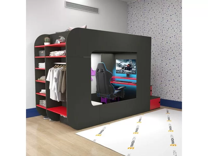 Krevet na sprat Ranza52 Š:260cm D:100cm V:190cm Sivi i crveni drveni visoki krevet za spavanje modela pruža savršeno rešenje za vašeg strastvenog gejming tinejdžera. Sa naglaskom na udobnosti i funkcionalnosti, ovaj krevet omogućava neometano uživanje u igrama, dok istovremeno pruža savršen prostor za kvalitetan san. Moderan i savremen dizajn Krevet na sprat Ranza52 vrhunskog kvaliteta ističe se svojim moderan dizajnom i bojama koje su trenutno popularne u svetu igara. Ovaj krevet postaje nezaobilazan izbor za svaku tinejdžersku spavaću sobu. Sa integrisanim stolom, vaš tinejdžer može obaviti školske zadatke ili uživati u kompjuterskim igricama, a LED traka za osvetljenje doprinosi atmosferi pravog "gejmera". Fiksne merdevine na zadnjem delu kreveta omogućavaju jednostavan pristup gornjem delu, čime se štedi prostor. *Izgrađen sa na umu skladištenje* Krevet na sprat Ranza52 je dizajniran sa fokusom na praktičnost i efikasno korišćenje prostora. Sa ugrađenim policama na zadnjoj strani kreveta i otvorenim odeljkom za odlaganje odeće, ovaj krevet zadovoljava sve potrebe, čak i u manjim prostorijama. Važno je napomenuti da je dimenzije dušeka koje podržava 120 x 200 cm. *Jednostavna i laka konstrukcija* Krevet na sprat Ranza52 ne samo da izgleda kao deo celokupnog prostora, već je i jednostavan za samostalno montiranje. Detaljna uputstva olakšavaju proces sastavljanja, oslobađajući vas stresa. Krevet je izrađen od najkvalitetnijih materijala, obezbeđujući siguran i udoban san za vašeg tinejdžera. Ukratko, Ranza52 sivi i crveni drveni visoki krevet za spavanje predstavlja idealan spoj stila, udobnosti i praktičnosti za vašeg tinejdžera koji uživa u gejmingu. * Napomena: Dušek nije ukljucen u osnovnu cenu kreveta, a kompletnu ponudu mozete naci u kategoriji:Duseci Troškovi montaže i transporta nisu u ceni.
