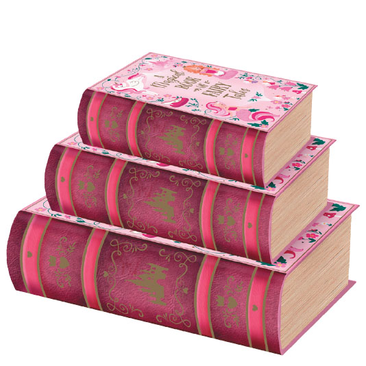 - Kutija u obliku knjige roza boje sa jednorogom i natpisom "A magical book of fairy tales". Kutija može biti za pakovanje poklona, knjige ili za čuvanje dragocenosti. Može se držati horizontalno ili vertikalno, medju drugim knjgama na polici. Dimenzije kutije su 34x25x10cm