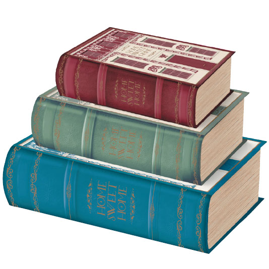 - Kutija u obliku knjige bordo boje sa slikom fronta kuće i natpisom Home Sweet Home. Kutija može biti za pakovanje poklona, knjige ili za čuvanje dragocenosti. Može se držati horizontalno ili vertikalno, medju drugim knjgama na polici. Dimenzije kutije su 22x15x6cm.