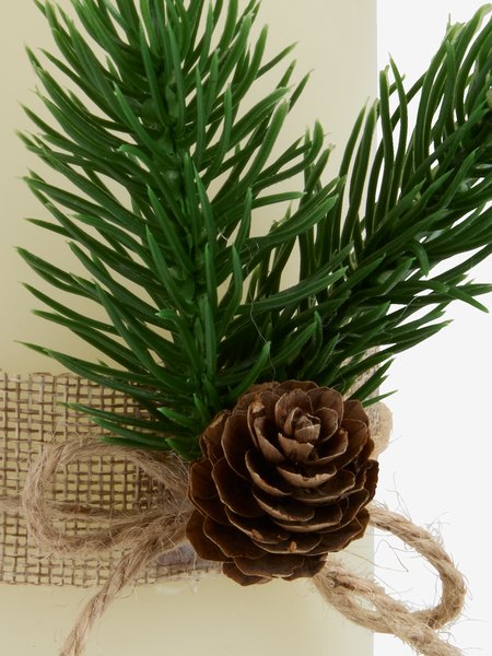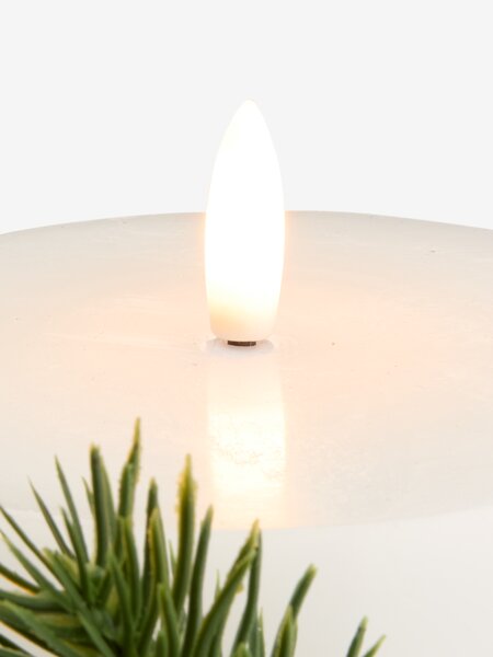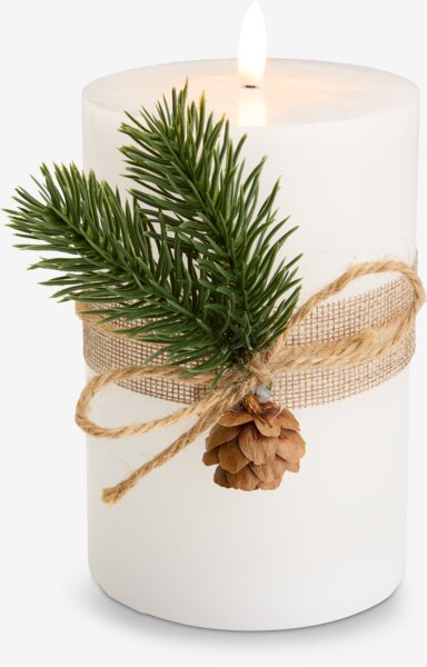 Bela LED sveća od parafina sa realističnim plamenom i dekorativnom trakom sa grančicom. Pruža prijatan, topao sjaj i poseduje funkciju tajmera – uključuje se na 6 sati, a isključuje na 18 sati. Radi na 2 x AA baterije (nisu uključene).