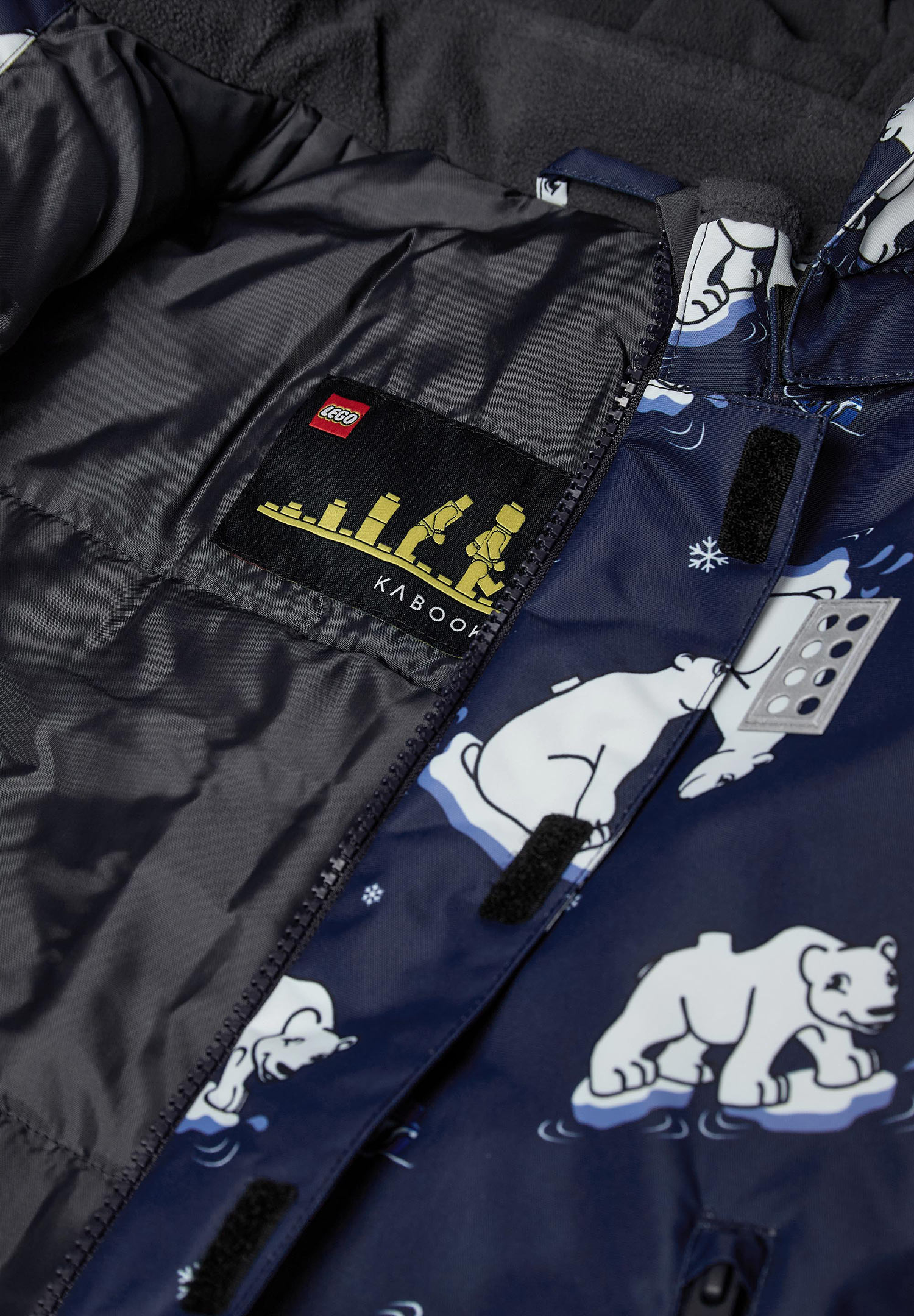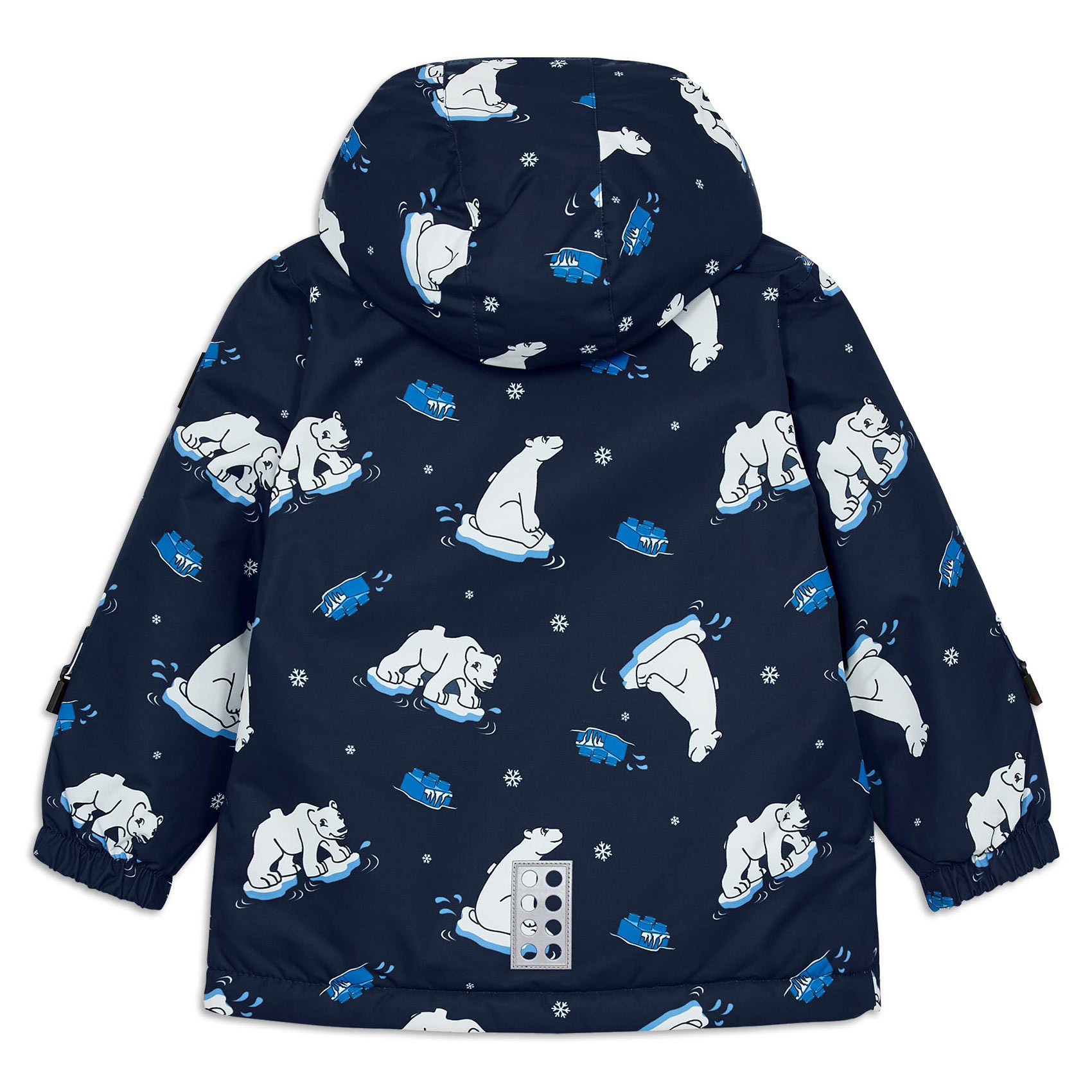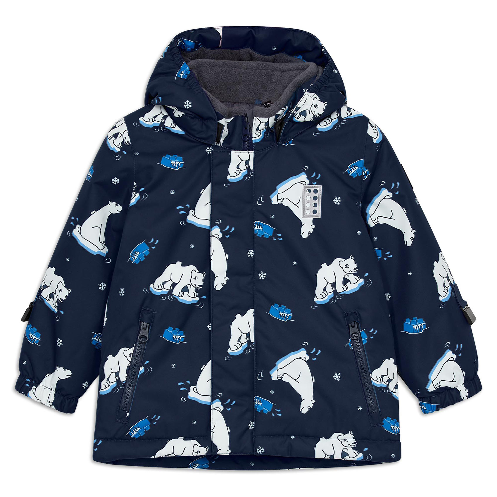 Tamnoplava funkcionalna LEGO DUPLO zimska jakna sa vodonepropustljivošću od 10.000 mm i reflektujućim detaljima u obliku LEGO kockica.