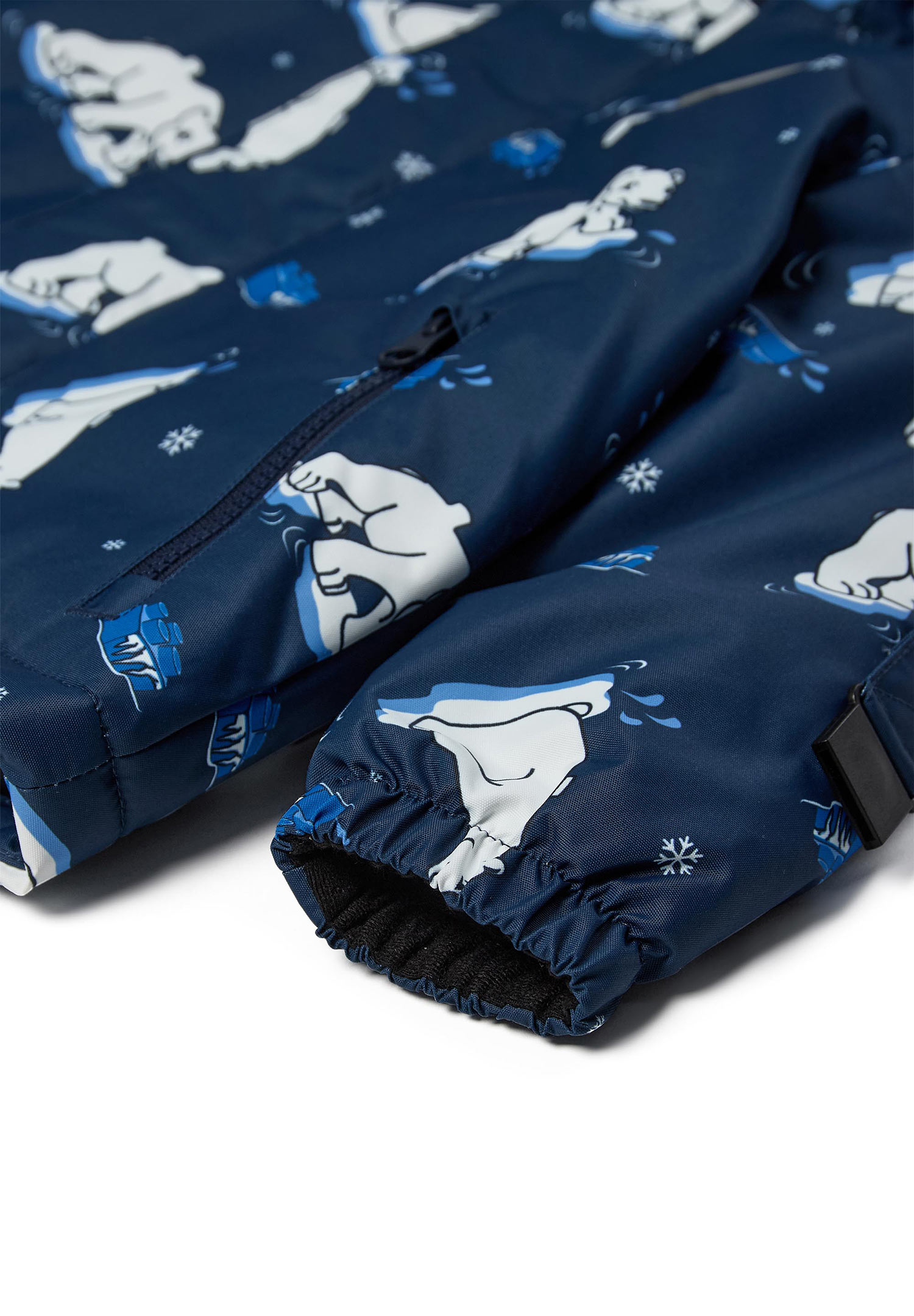 Jakna ima motive polarnih medveda i pahulja, a unutrašnjost kapuljače, kragne i džepova je postavljena flisom za dodatnu toplotu i udobnost. Sigurnosna rešenja, poput kapuljače i kopči za rukavice koje se otkačinju pod pritiskom, čine ovaj model savršenim izborom za zimsku zabavu.
