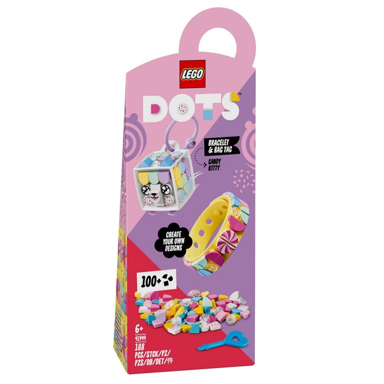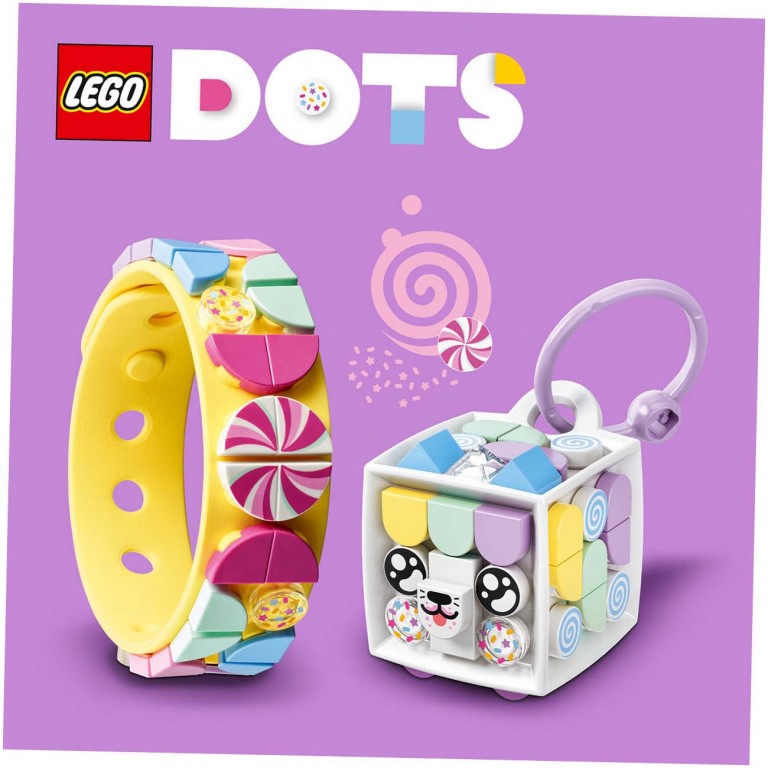 Zasladi svoj stajling pomoću ovog kompleta LEGO® DOTS Maca Bombonica! Počni od narukvice, dodaj pastelne pločice i stilizuj je spiralom u boji slatkiša – ili pločicama posutim dekorativnim detaljima. Na privesku za torbu stilizuj macu u skladu sa raspoloženjem, sa svetlim bojama i načuljenim ušima. Uzmi torbu Serije 6 Extra DOTS (prodaje se zasebno) za još veću zabavu. Zatim stavi narukvicu i privezak za torbu i pokaži svoju slatkastu stranu!