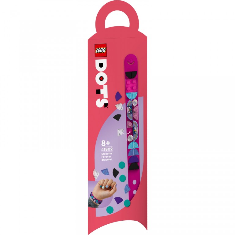 - Poznajete fana fantazije ili jednoroga uzrasta 8+ koji voli magijsku umetnost i dizajn? Počastite ga kompletom LEGO® DOTS Narukvica „Jednorozi zauvek” (41802). Kesica uključuje podesivu narukvicu boje magente, mnoštvo obojenih pločica, sa prelivajućim bojama i šljokicama, metalik pločice ukrašene rogom jednoroga i opalescentnim krilima, kao i „dijamantske” elemente za dodatnu blistavost. Pakovanje uključuje inspiraciju koja će pomoći da se podstakne dečja kreativnost. Narukvica može da se dekoriše čim se izvadi iz kese, a deca mogu da dizajniraju obrasce u skladu sa sklonostima, odevnom kombinacijom ili raspoloženjem.