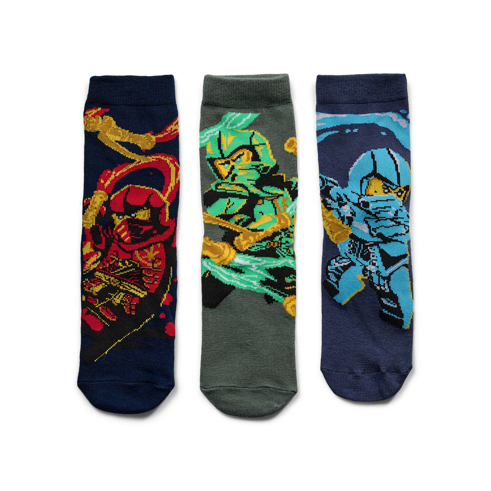 Prelepe, šarene i izuzetno udobne čarape sa LEGO NINJAGO temom. U pakovanju se nalaze tri para čarapa, a na dečačkim čarapama su prikazani portreti klasičnih nindži – Nye, Kaija i Lloyda.