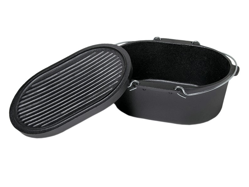 - Posuda sa gril poklopcem je napravljena od visokokvalitetnog livenog gvožđa. Poseduje duboku posudu zapremine 9l i poklopac koji se može koristiti kao gril tiganj ili roštilj ploča.