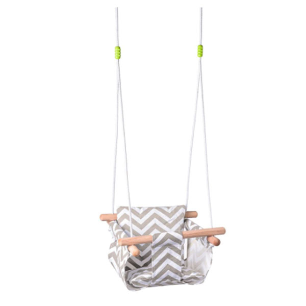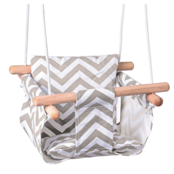 - Udobna, dečija ljuljaška za najmladje, sastoji se od čvrstog, glatko brušenog drvenog okvira i tekstilnog materijala (100% pamuk) u sivom dizajnu.