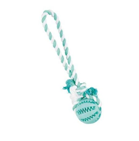 Loptica od prirodne gume, na pamučnom kanapu, ukusa mentola, sa omčom za ruku, za negu desni Vašeg ljubimca.