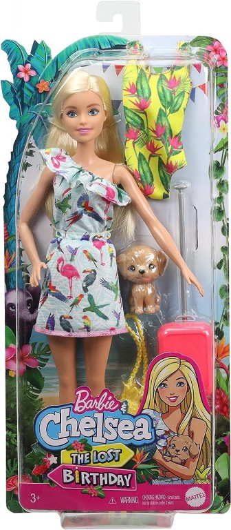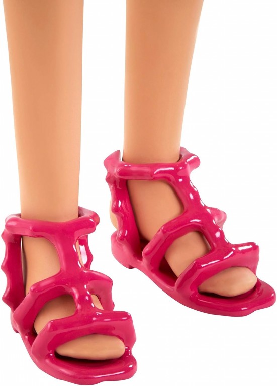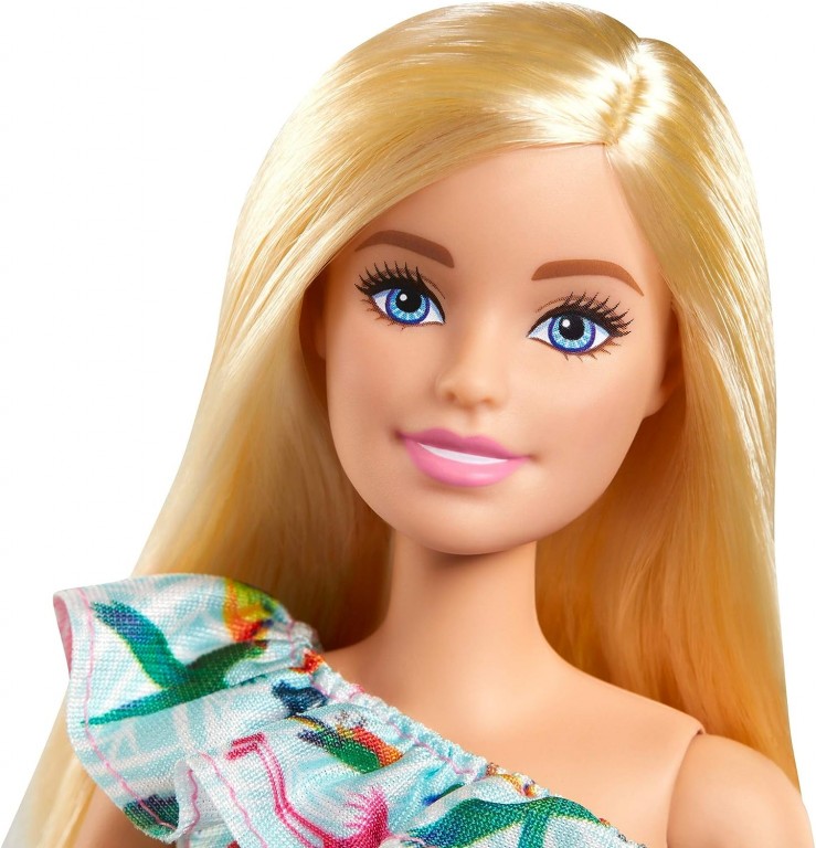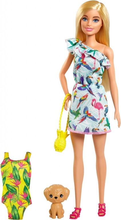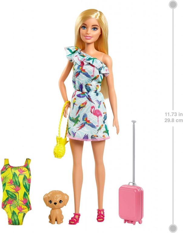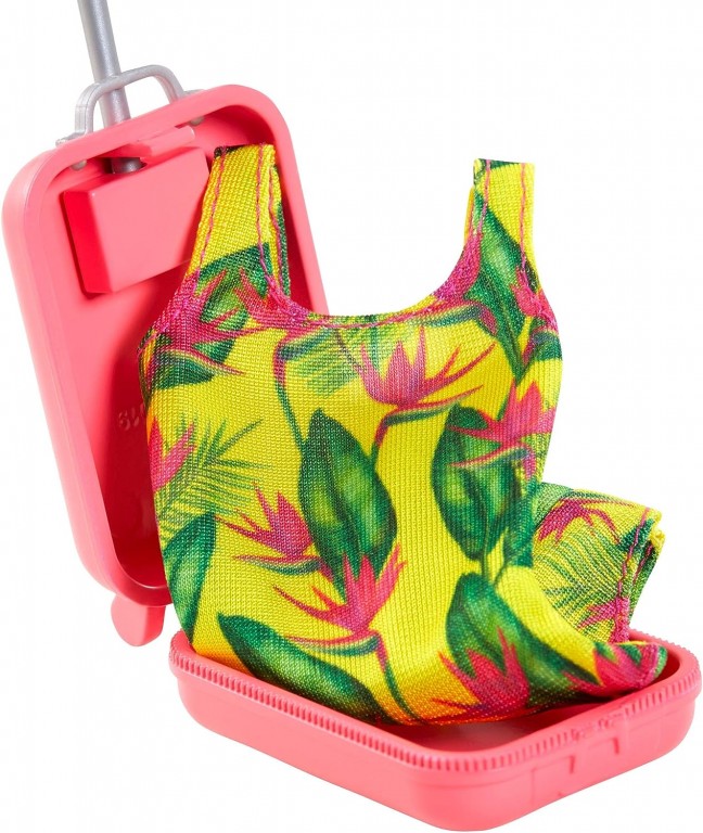 - Barbi lutka nosi modernu putnu haljinu sa tropskim uzorkom i ružičaste sandale.