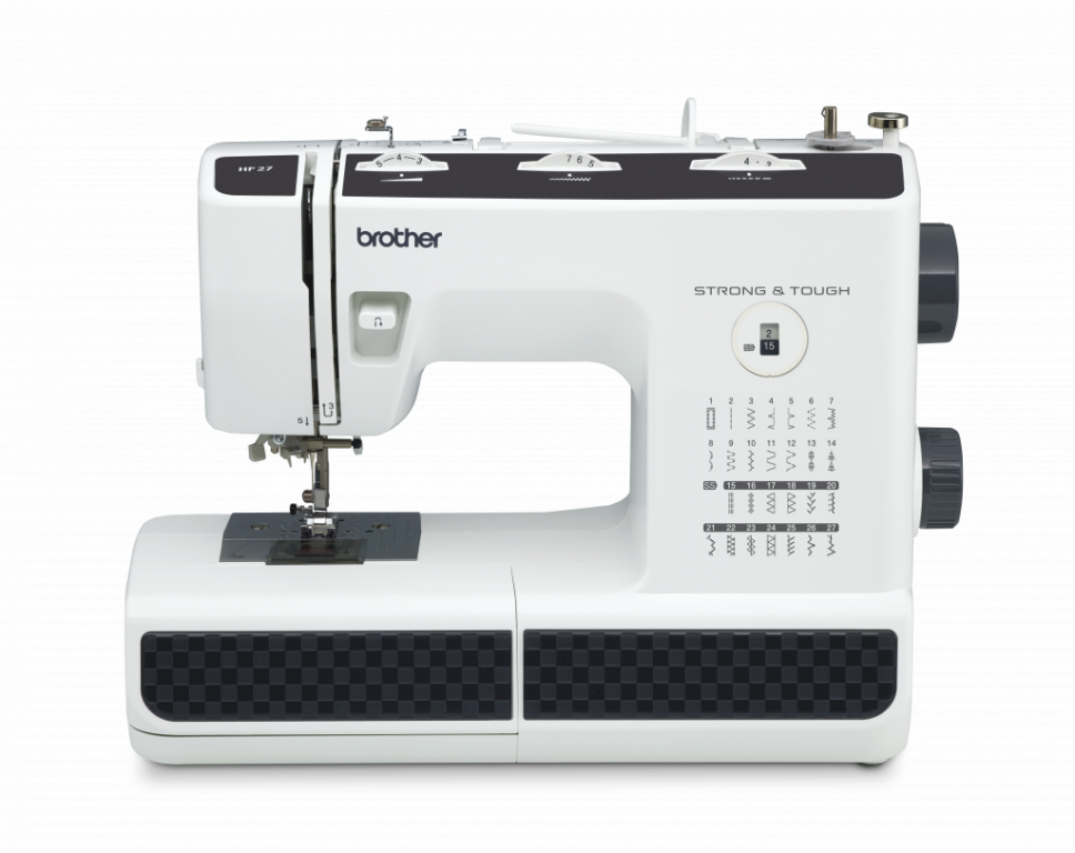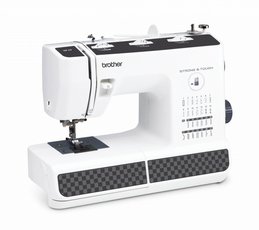 • HF27 je robusna mašina za šivenje, koja je primerena za rad na svim materijalima. Stopica sa dugmetom za zaključavanje, metalna ubodna ploča, klizeća stopica i snažna metalna konstrukcija omogućavaju šivenje još debljih materijala. Ima čak 27 programa za šivenje, uključujući i bodove za rastegljive materijale, a uz pomoć funkcije za izradu automatske rupice za dugme ošpićete rupicu za dugme u jednom koraku. Zarezi na vretenu za namotavanje konca i sistem za jednostavno postavljanje špulne znatno će vam olakšati pripremu za šivenje!