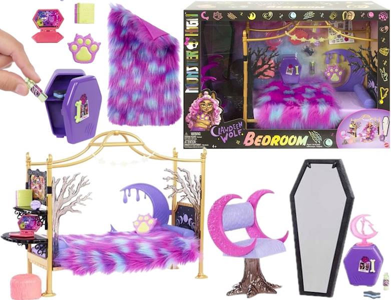 Monster High Bedroom, unikatna spavaća soba za čudovišta sa stilom. Set sadrži: krevet, radni sto, mini frižider i radno ogledalo, kao i mnoštvo dodataka za sablasnu zabavu.