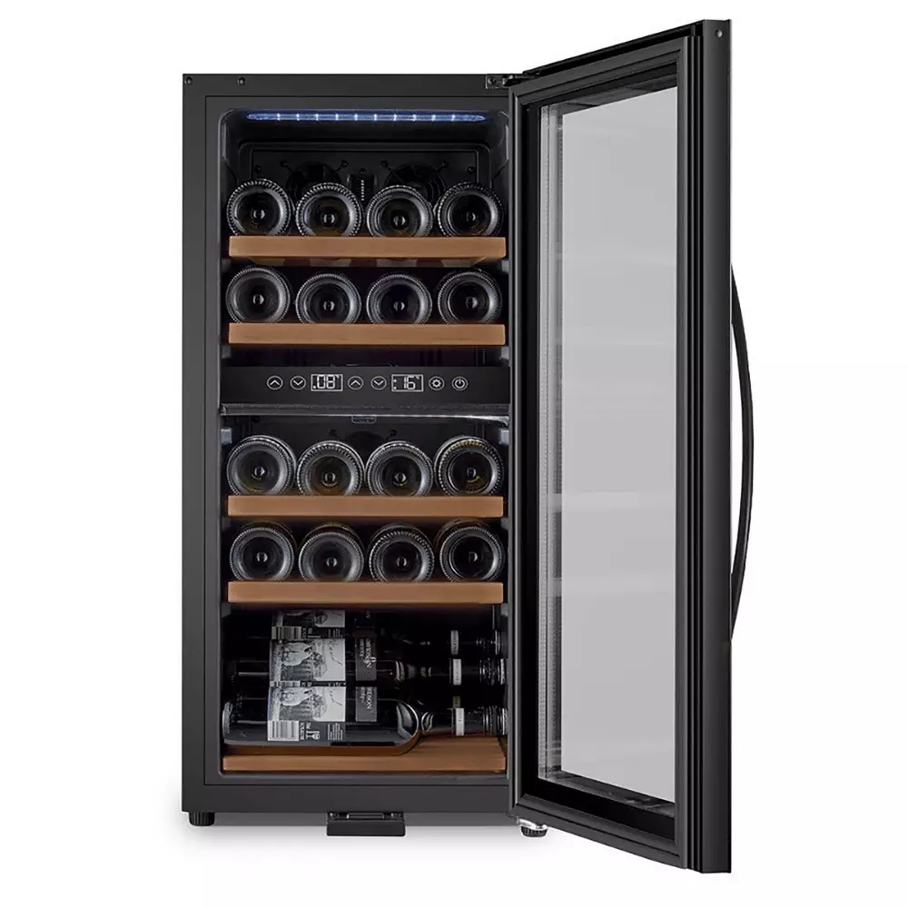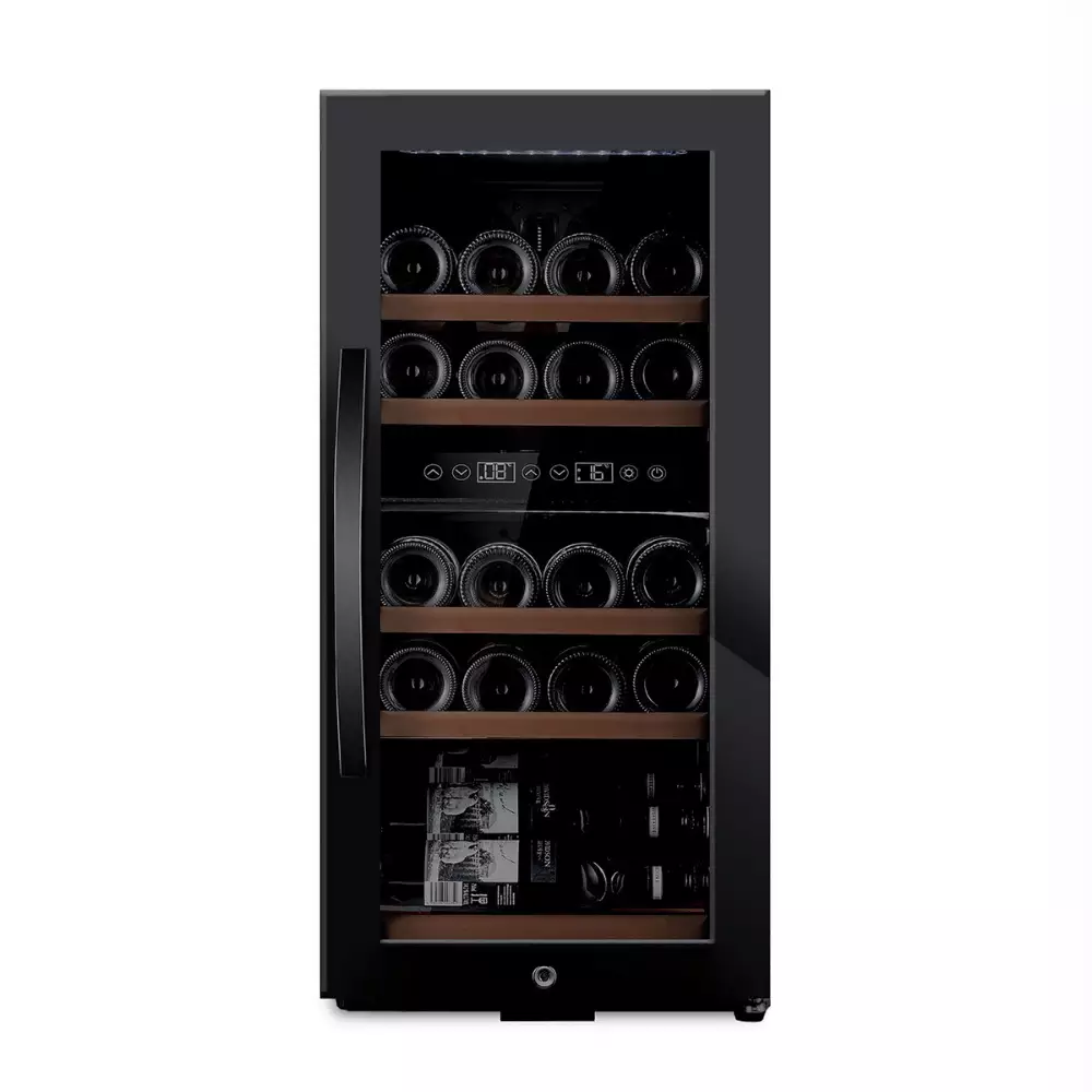 Model izložbenog ormara ima dve temperaturske zone, što omogućava izuzetnu fleksibilnost u skladištenju različitih vrsta vina, jer možete čuvati belo i crveno vino u jednom ormaru, svako na optimalnoj temperaturi. Donji deo ima mogućnost čuvanja otvorenih boca.