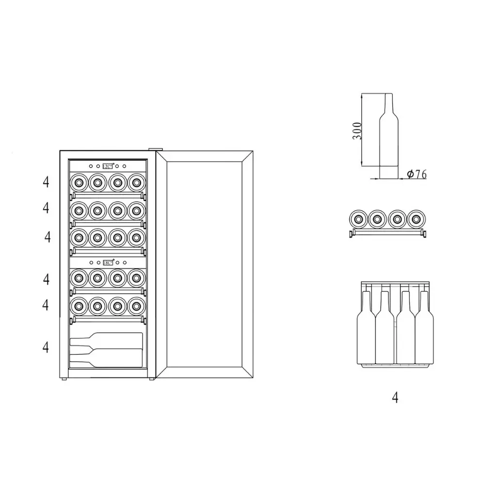 Sa visinom od približno 880 mm, dubinom od 540 mm i širinom od 395 mm, vitrina nudi veliki kapacitet i može da smesti do 24 boce (0,75 l Bordo). Zahvaljujući promišljenim dimenzijama, lepo se uklopiće u različite prostore za život, a istovremeno omogućava lako postavljanje kao samostalni estetski akcenat.