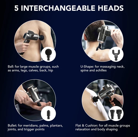 U kombinaciji sa najnovijom tehnologijom - Pošto je u stanju da dosegne mišićne grupe od 10 mm dubine, pištolj za masažu efikasno razbija višak mlečne kiseline i pruža olakšanje i udobnost telu. Slanjem visokofrekventnog pulsa pritiska na mišiće, on može raditi na dubokom tkivu kako bi podstakao oporavak mišića. 5 nivoa intenziteta u 1 klik - motor bez četkica od 24V visokog obrtnog momenta, pruža duboku vibrirajuću masažu u rasponu od 2000 do 3200 udara u minuti. 5 nivoa intenziteta masaže, podesivih u samo 1 klik. Pištolj za masažu poboljšava protok krvi i smanjuje bol u mišićima, pomažući fizičkoj fleksibilnosti i funkcionalnosti. 5 glava za masažu, multifunkcionalne - 5 zamenljivih aplikatora za masažu koji se fokusiraju na različite delove tela, zadovoljavajući sve vaše potrebe za masažom. Ergonomski dizajn, brzo hlađenje, dug životni vek baterije - 10 minuta zaštitno podešavanje za automatsko isključivanje i mikroelektronski sistem hlađenja. Baterija velikog kapaciteta od 2500 mAh omogućava mu da neprekidno radi 5-7 sati. Niska radna buka, inženjerska drška od 41 mm sa silikonskim omotačem, sve dizajnirano za vašu bezbednost. Lagan, pristupačan i prenosiv - težak samo 2 lbs, ovaj pištolj za masažu je pristupačan, izdržljiv i pogodan za putovanja. Sa posebno dizajniranom torbicom za nošenje, to nije samo odličan saputnik već i brižan poklon za sve vaše prijatelje i porodicu.