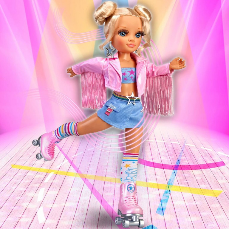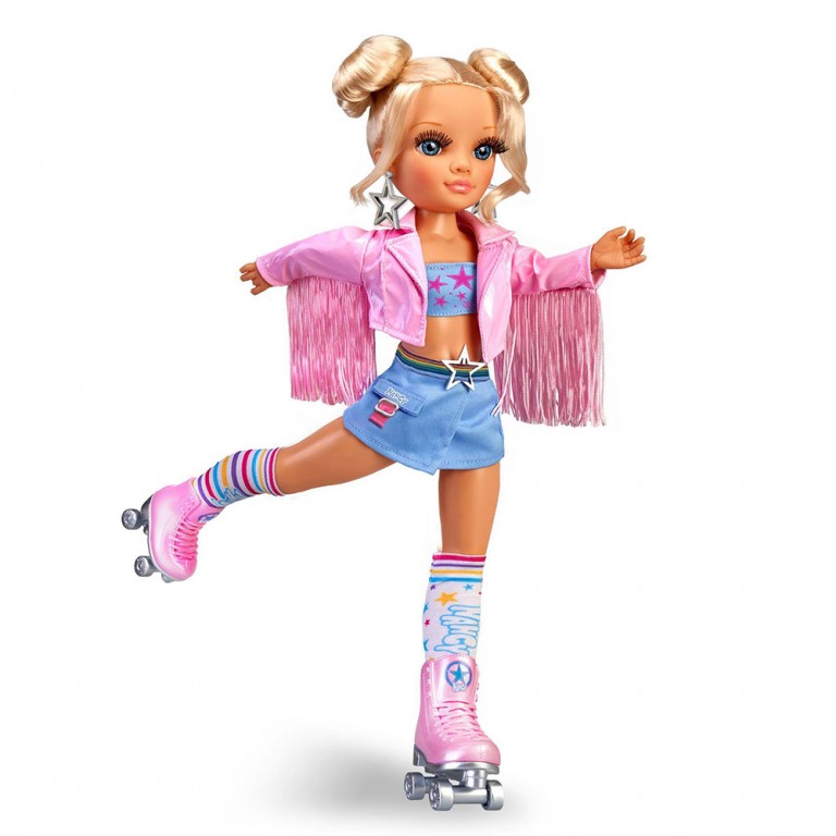 - Obučena je u ružičatu jaknu sa resama koja odgovara njenim rolerima, plavi top, mini suknju i raznoboje prugaste čarape do kolena sa zvezdicama.