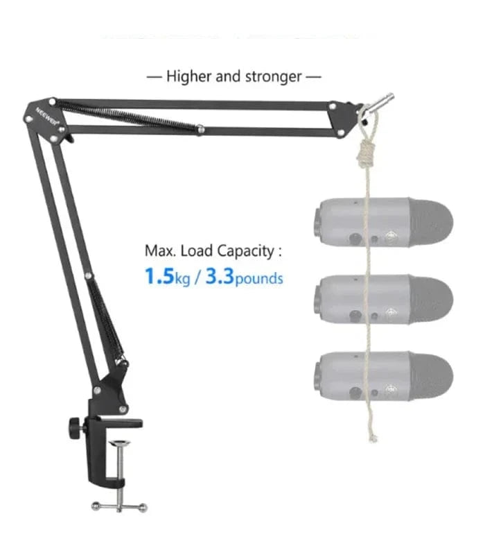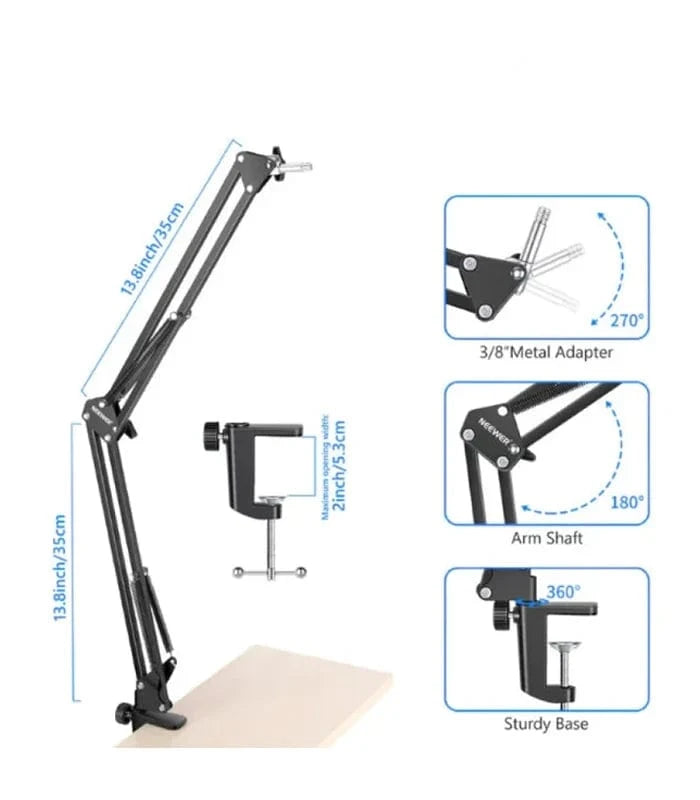 Neewer držač mikrofona je izuzetno koristan alat za sve koji se bave stvaranjem sadržaja, snimanjem ili podkastovanjem. Ovaj uređaj omogućava lako pozicioniranje mikrofona, čime se postiže maksimalan kvalitet zvuka. Njegova fleksibilnost i snaga čine ga idealnim za muzičare, podkastere i sve one koji žele profesionalnu audio produkciju.. Pravilno postavljanje mikrofona je ključno za postizanje čistog i preciznog zvuka. Neewer držač mikrofona omogućava brzo podešavanje i stabilnost, što znači da možete snimati u optimalnim uslovima bez ikakvih smetnji ili neprijatnosti tokom rada.. Glavne karakteristike:. Kompatibilnost sa raznim mikrofonima: Podržava do 1,5 kg težine, što omogućava upotrebu sa širokim spektrom profesionalnih mikrofona.. Čvrsta čelična konstrukcija: Garantuje dugotrajan rad i otpornost na habanje, pružajući visoki nivo stabilnosti.. Podesiv dizajn: Lako možete postaviti mikrofon u željeni položaj i pronaći najbolji ugao za snimanje.. Stezaljka za montiranje: Maksimalna širina stezaljke je 7 cm, što omogućava lako montiranje na sto ili drugu radnu površinu.. Jednostavan za upotrebu: Brzo postavljanje mikrofona, idealno za podkastere i muzičare koji često menjaju pozicije mikrofona.. Neewer držač mikrofona je siguran i izuzetno stabilan, zahvaljujući robusnoj izradi od čelika, što garantuje dugoročnu upotrebu bez gubitka funkcionalnosti.. Prikazana cena uključuje PDV!. Napominjemo da se angažujemo kako bismo pružili najprecizniji opis proizvoda uz detaljne slike i cene. Međutim, moramo istaći da ne možemo garantovati potpunu tačnost svih informacija bez eventualnih grešaka.