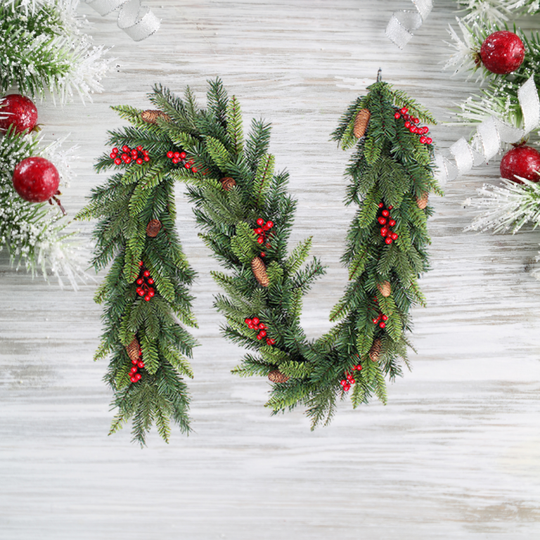 - Novogodišnja girlanda se odlikuje dimenzijom od 200cm, gusto raspoređenim granama, i ugrađenim dekorativnim ukrasima.