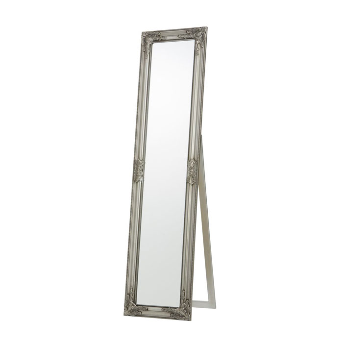 Ogledalo, stojeće, sa zakrivljenim ivicama. Ram ogledala je sa srebrnim efektom.