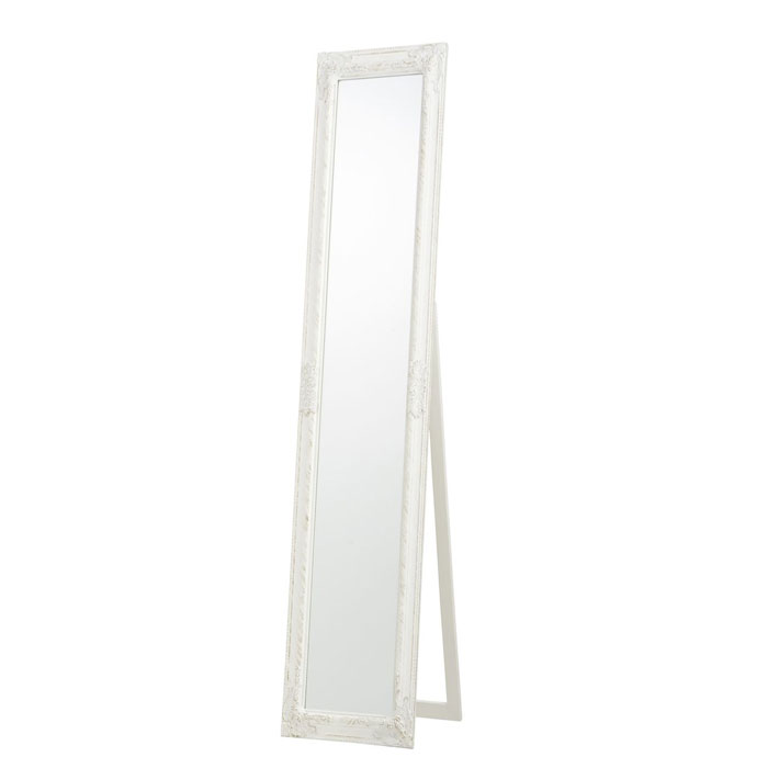 Stojeće ogledalo sa zakrivljenim ivicama, i belim ramom sa zlatnim efektom
