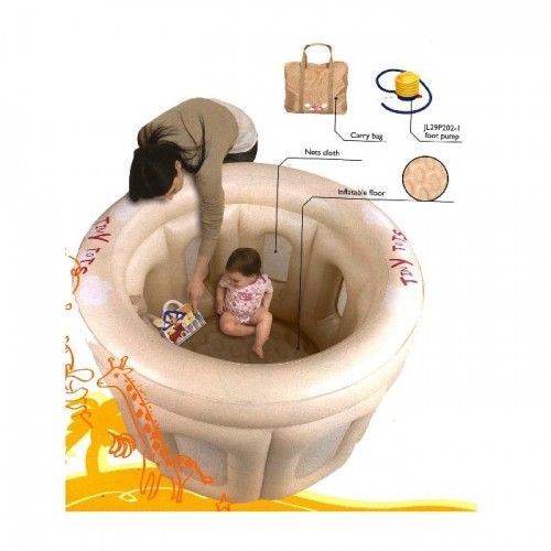 Vrlo pratkična ogradica za bebe. Može da posluži kao ogradica/ igraonica, ali i kao krevetić jer je pod izuzetno udoban. Pod i zidovi su na naduvavanje. Zidovi imaju prozirne mrežice. Set sadrži pumpu i torbu za lakši transport