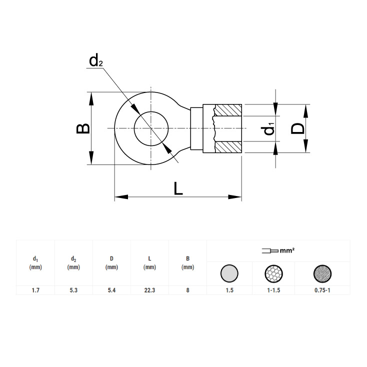 DimenzijeL: 22.3 mm, d1: 1.7 mm, d2: 5.3 mm, M5