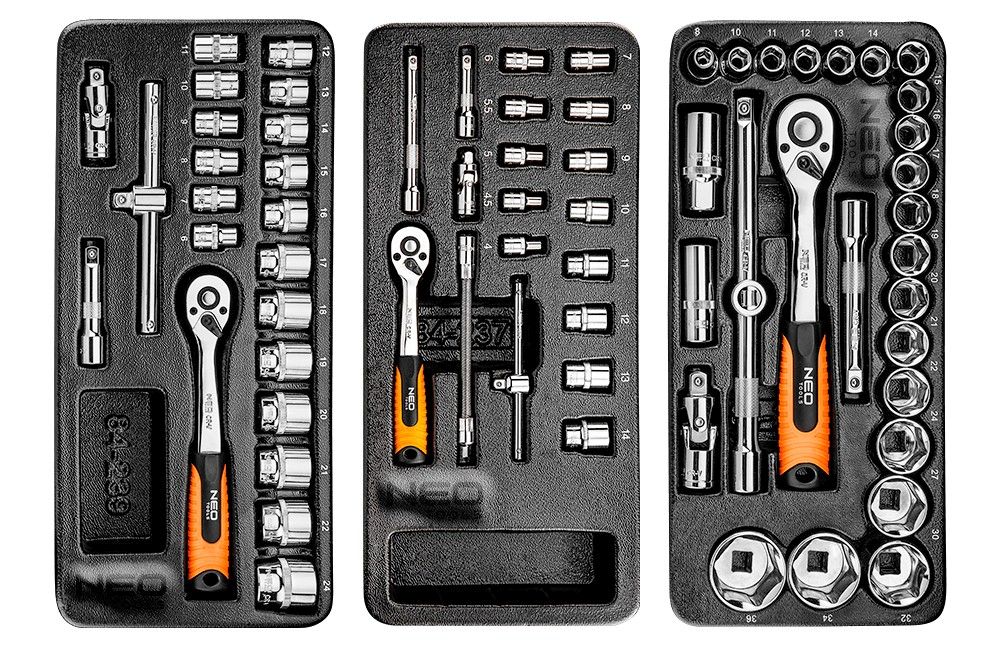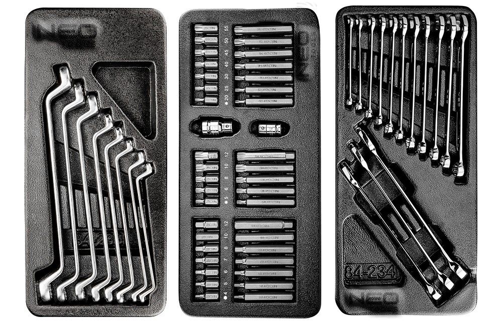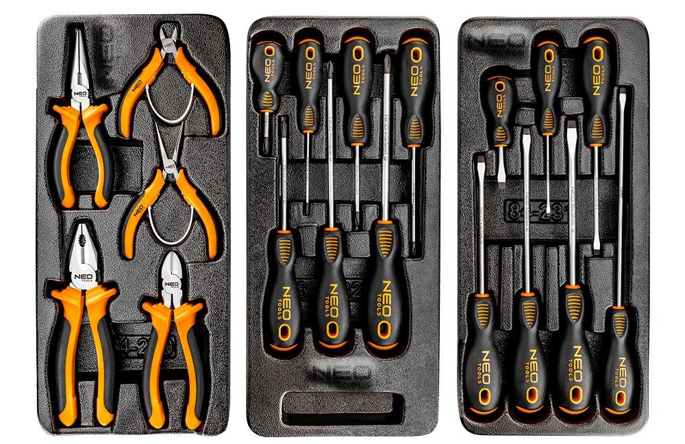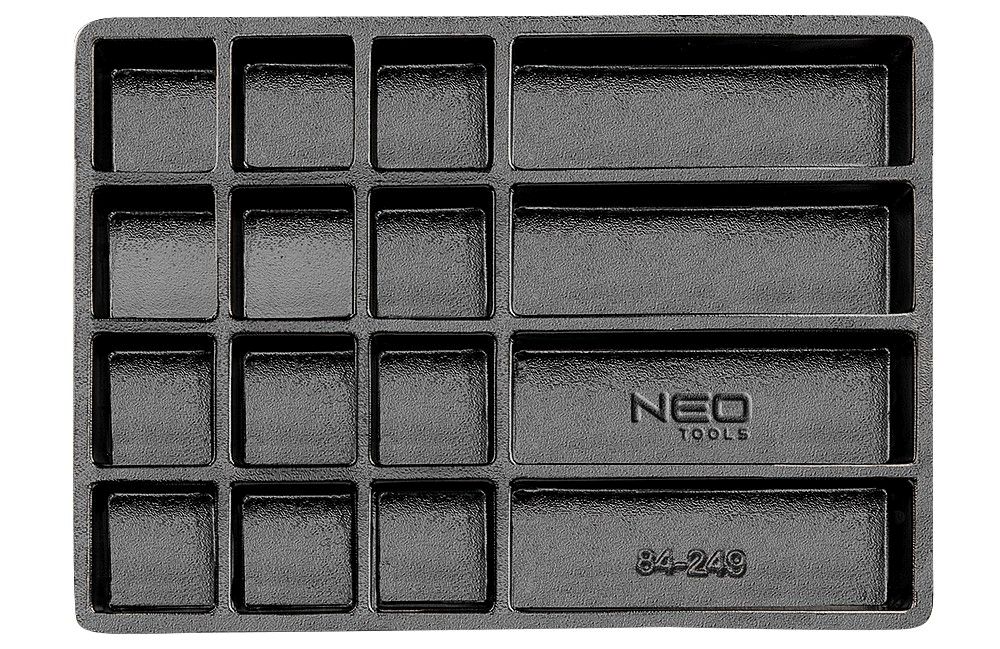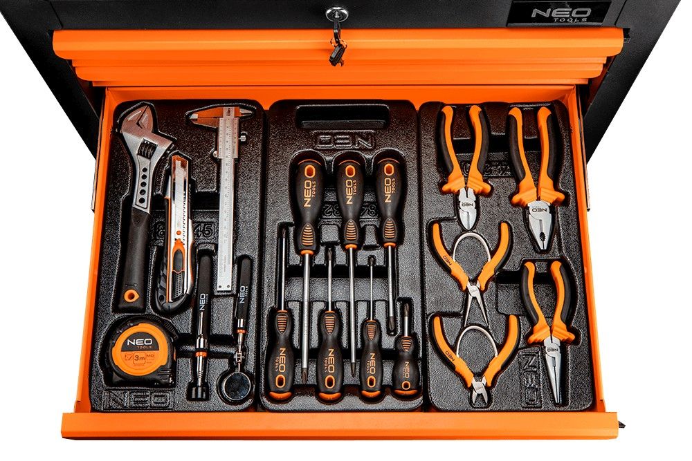 Ormarić za alat NEO TOOLS 84-221+G veličine 680x460x1030 mm. Ormar ima 6 praktičnih fioka za alate, zaključanih centralnim zaključavanjem. Sve fioke se potpuno otvaraju, imaju kuglične vođice, koje pružaju dugotrajan, tečan i pouzdan rad. Fioke se spašavaju blokiranom blokadom, koja obezbeđuje bezbednost okoline tokom transporta. Površina radnog prostora prekrivena gumom, uljem i otpornom na masnoće. Tihi, zakretni točkovi od 5 inča pojednostavljuju manevrisanje, a dodatno su opremljeni kočnicom. Nosivost 280 kg. Ormar opremljen držačem koji olakšava vođenje. Pouzdanost proizvoda potvrđena je 25-godišnjom garancijom proizvođača. Pored toga, opremljen je umetcima sa popularnim alatima.